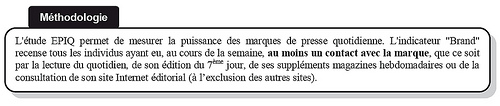 Mais il faut d’abord rappeler un distinguo important. Ici, monsieur, on ne parle pas simplement d’exemplaires vendus, on n’est pas de vulgaires boutiquiers. Non, ici, on parle d’audience, concept plus flou et qui a surtout l’avantage de laisser une marge de manÅ“uvre beaucoup plus importante. L’audience, qu’est-ce donc ? Le nombre de personnes qui lisent chaque exemplaire vendu ? Plus seulement, soyons généreux et larges en inventant “ l’audience de moins de 8 jours ” pour les quotidiens, soit le ” Nombre de personnes en contact chaque semaine avec la marque au travers du quotidien, de son site Internet ou d’un supplément “. Prière de ne pas rire et même de savourer à sa juste valeur cette définition jésuitique au possible : “en contact avec la marque”… Avec un tel filet, ce serait un comble de ne pas pêcher un maximum de poissons en effet.