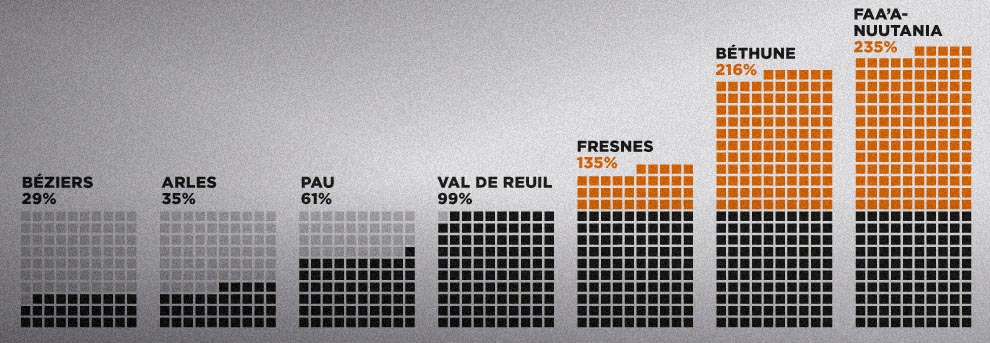 L’Outre-Mer est la terre des extrêmes. Aux îles Marquises, la maison d’arrêt de Taiomac est l’une des moins remplies avec un détenu pour cinq places, ou encore Mata-Utu où la prison de trois places était vide en juin. Ces écarts masquent des réalités plus complexes en métropole où les immenses établissements pénitentiaires regroupent le plus de détenus en surnombre.