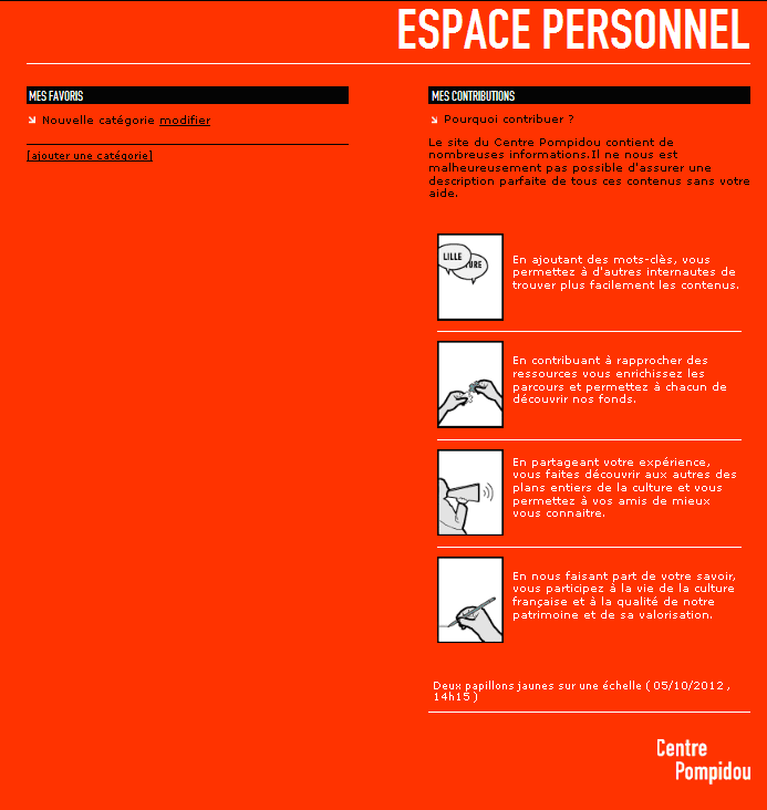 L’interface permet en effet à l’usager d’ouvrir un espace personnel pour “contribuer” de différentes manières : en ajoutant des mots clés sur les notices des oeuvres, en proposant des liens entre les différentes ressources du site ou en soumettant des enrichissements éditoriaux. Tous ces contenus produits par les utilisateurs seront remployés, grâce aux technologies sémantiques déployées sur le site, afin d’améliorer la navigation au sein des contenus. Mais les informations résultant de ce travail de “petites mains”, réalisé bénévolement par les internautes, deviendront aussi des données publiques et tomberont sous le coup de l’interdiction de réutilisation maintenues pour l’instant par le Centre Pompidou.